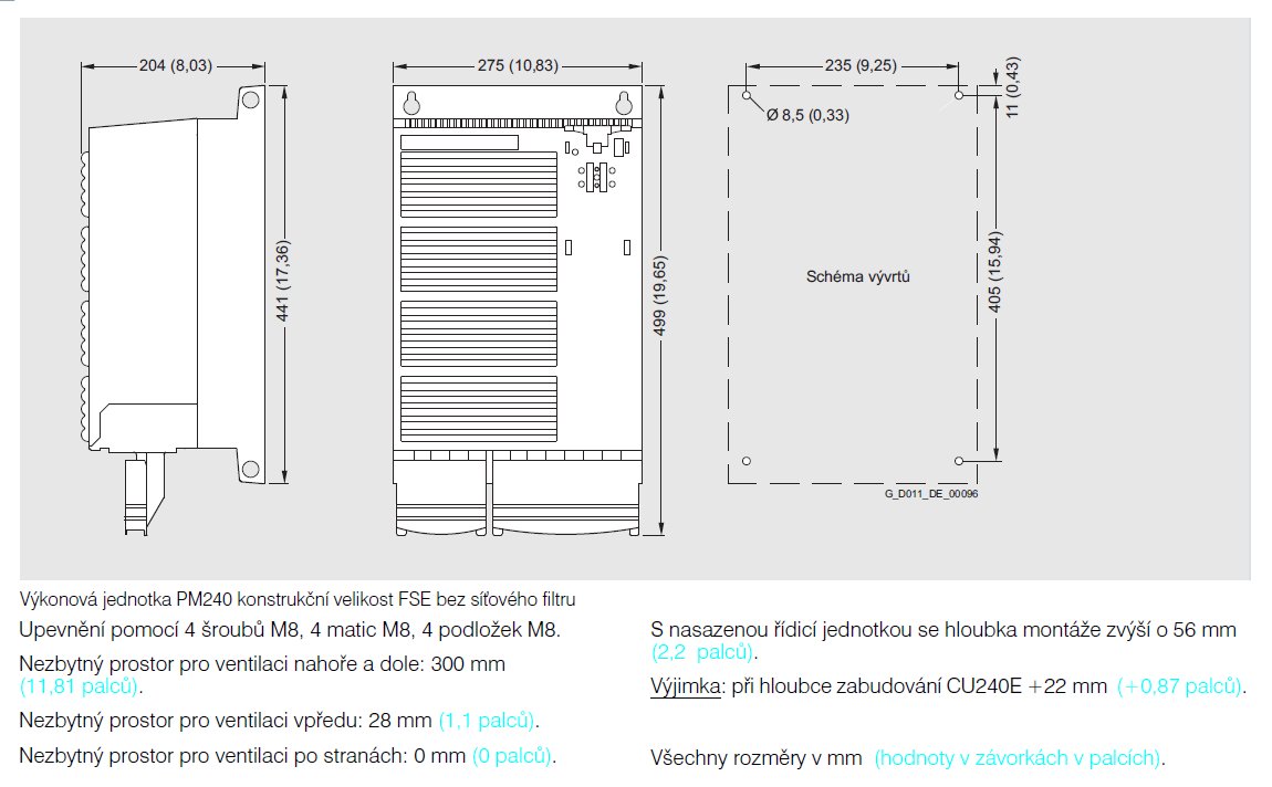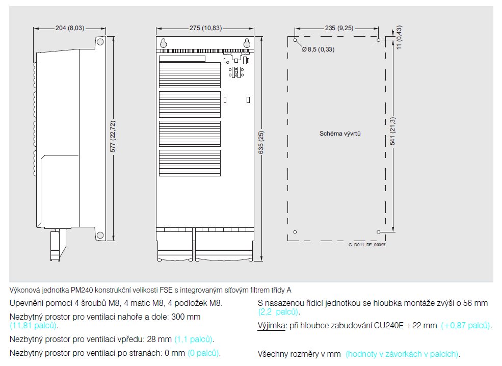Konstrukční velikosti FSB a FSC výkonové jednotky PM240 existují jak s integrovaným síťovým filtrem třídy A, tak bez něj. Pro dosažení třídy B musí být výkonové jednotky PM240 s integrovaným síťovým filtrem třídy A dodatečně vybaveny filtrem třídy B do spodní části.