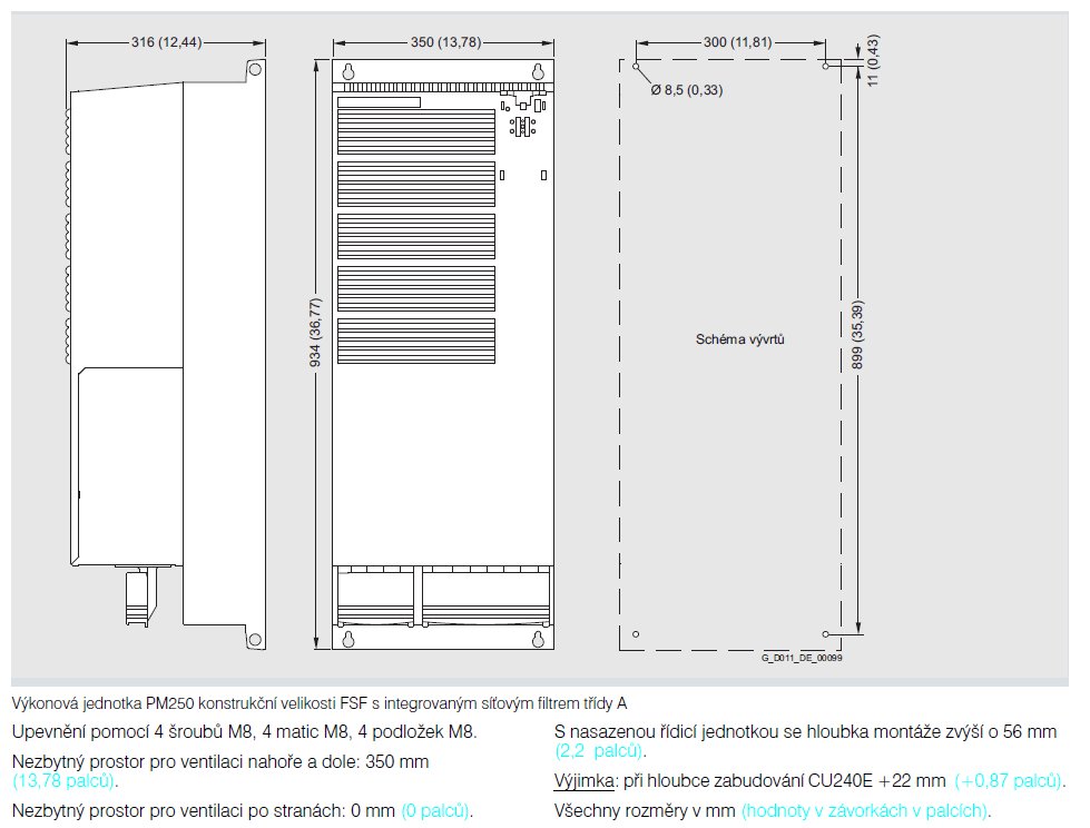 Konstrukční velikosti FSB a FSC výkonové jednotky PM240 existují jak s integrovaným síťovým filtrem třídy A, tak bez něj. Pro dosažení třídy B musí být výkonové jednotky PM240 s integrovaným síťovým filtrem třídy A dodatečně vybaveny filtrem třídy B do spodní části.