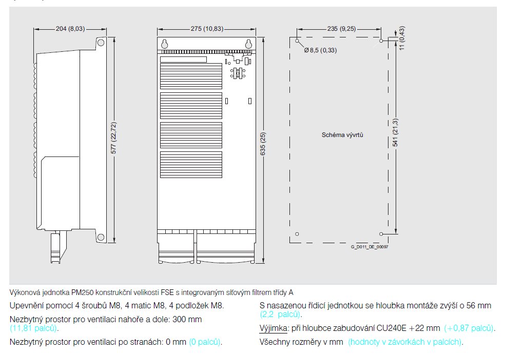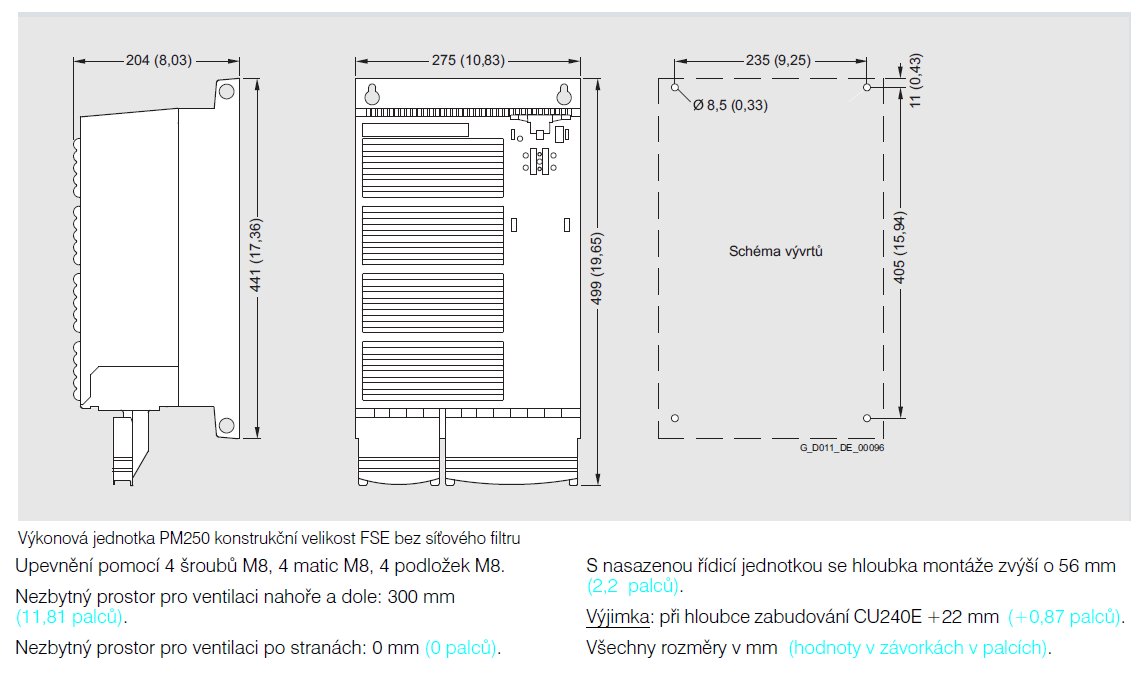 Konstrukční velikosti FSD až FSF výkonové jednotky PM250 existují jak s integrovaným síťovým filtrem třídy A, tak bez něj. Pro konstrukční velikost FSC výkonové jednotky PM250 s integrovaným síťovým filtrem třídy A existuje pro dosažení třídy B dodatečný filtr pro montáž na spodek třídy B (viz síťové výkonové komponenty).