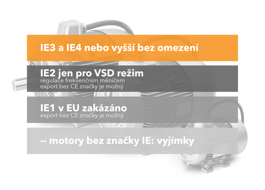 V současné době nabízíme elektromotory ve všech třídách účinnosti IE1, IE2, IE3 a IE4, stejně jako motory s výjimkou, bez označení účinosti.